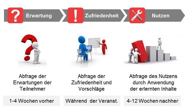 Befragen Sie Ihre Teilnehmer: VOR der Veranstaltung zur Abfrage der Erwartungen, WÄHREND der Veranstaltung zur Abfrage der Zufriedenheit und NACH der Veranstaltung zur Ermittlung des mittelfristigen Nutzens für die Teilnehmer.