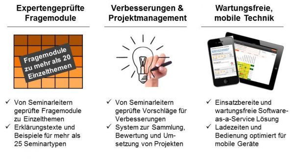 - Handlungsorientiert: Teilnehmer können zu jedem Thema Verbesserungsvorschläge einbringen und aktiv an deren Umsetzung mitwirken
